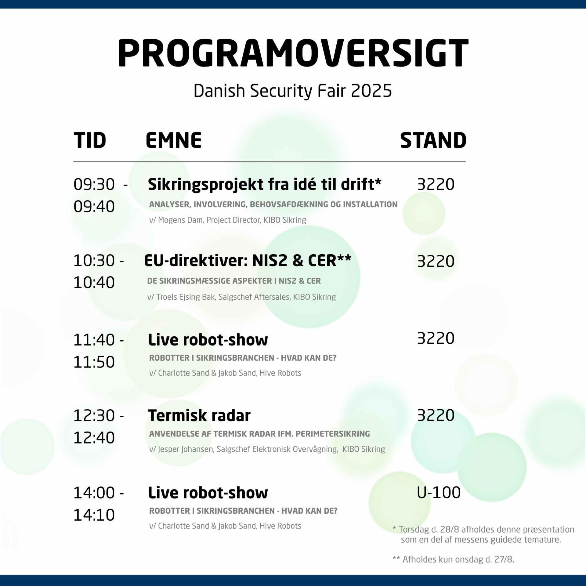 Hver dag er desuden spækket med spændende præsentationer, hvor vores fagfolk fortæller om alt fra perimetersikring (mekanisk sikring og elektronisk overvågning), NIS2 og CER til anvendelse af termisk radar.