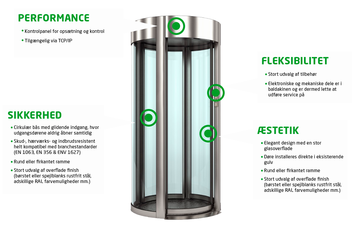 Sluserne sikrer passage af kun 1 person. Sluserne kan bestilles i forskellige niveauer af indbrudssikring, ballistik- og eventuelle eksplosionsklasser. Alle kan nemt styres via en skærm eller ved et kontrolpanel, så du kan åbne og lukke, have kontrol over antallet af passager, få et overblik over serviceintervallet og generel status.